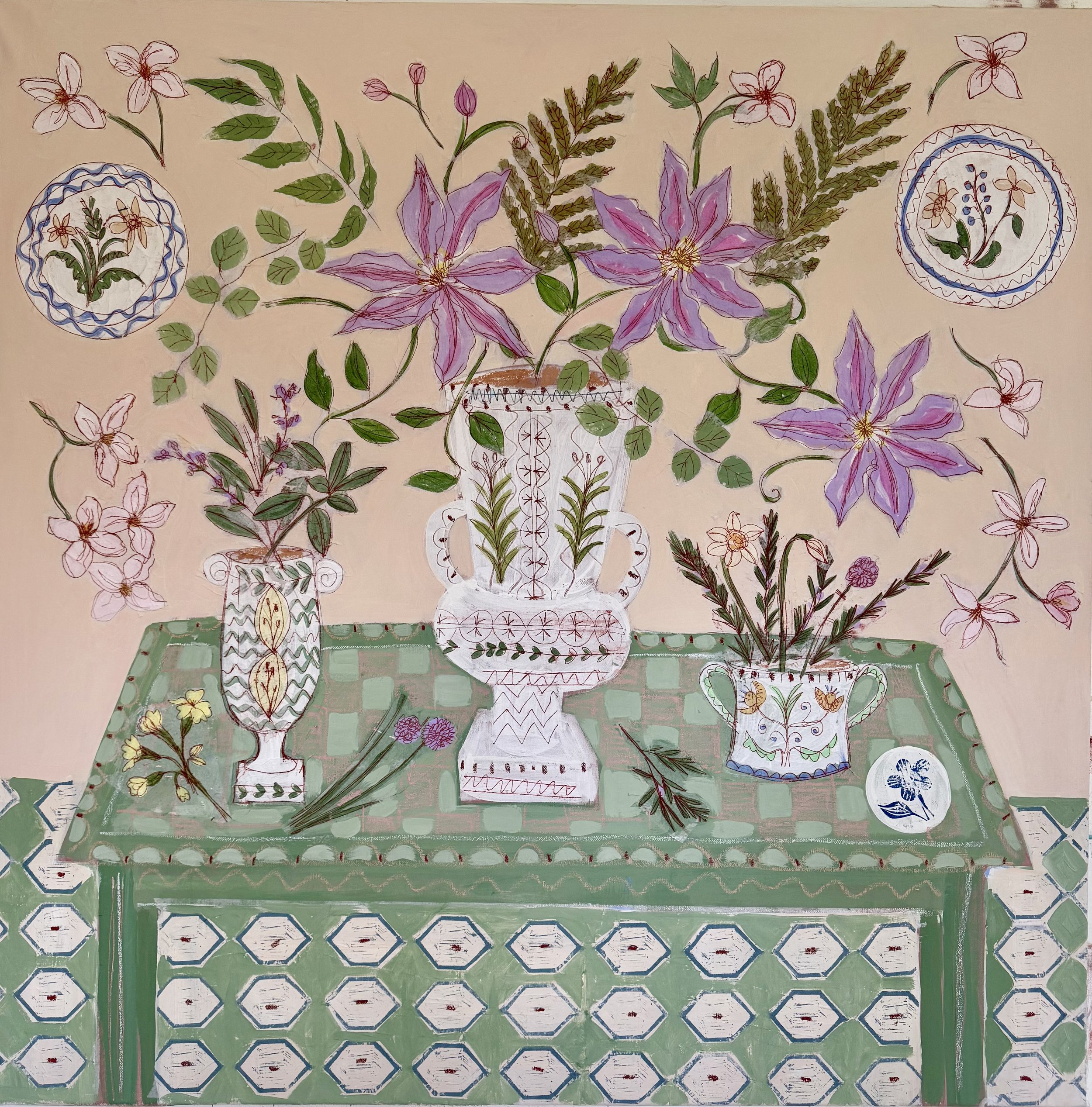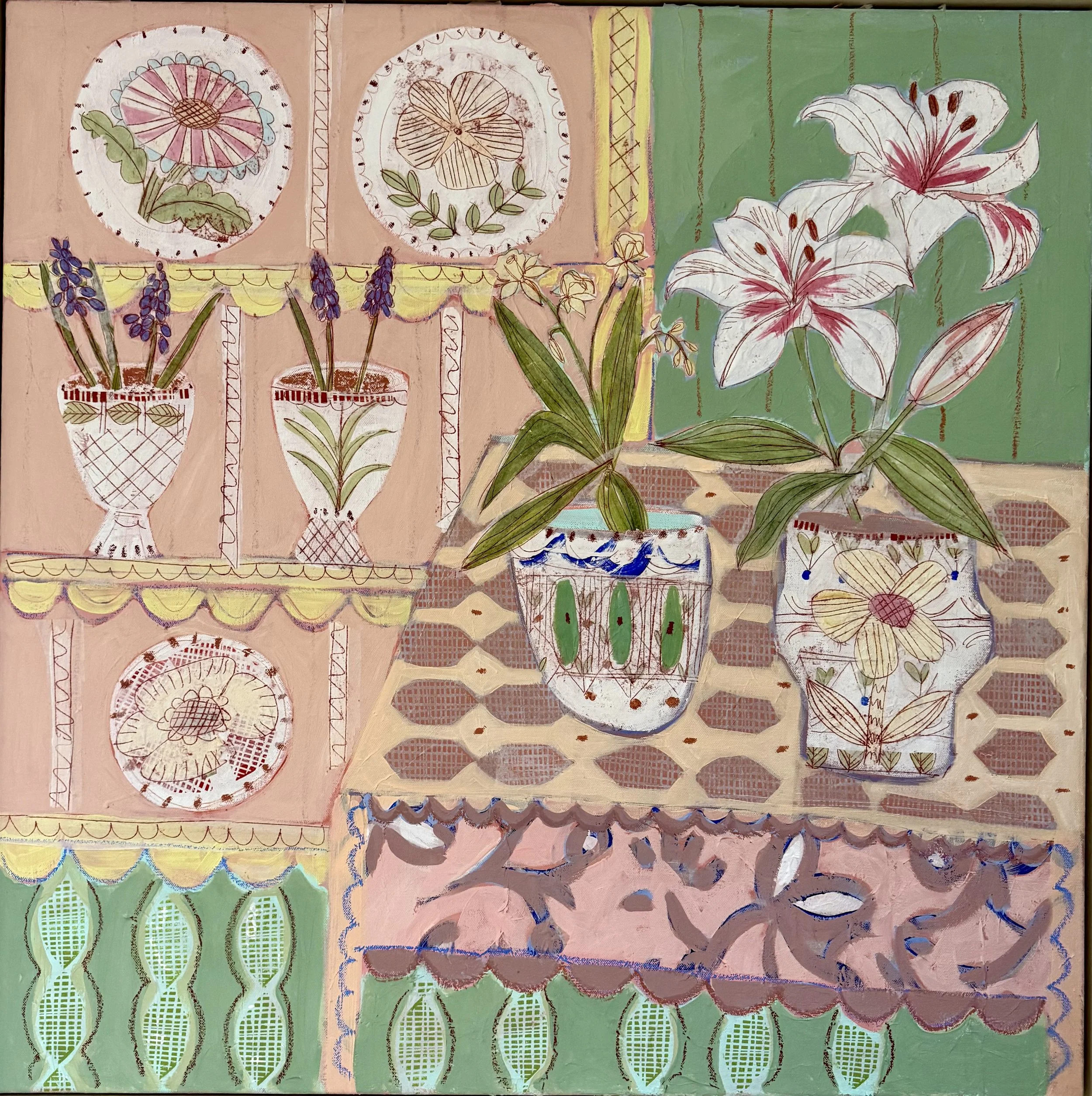 “Flowers are an important element of my work, adding a subtle energy that make the paintings come alive. Sometimes quiet, sometimes vibrant, but always bringing joy and beauty”
